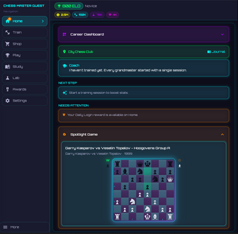 You start on a park bench. Through thousands of real tactical puzzles, famous grandmaster game study, and deep idle mechanics, you climb to the World Championship.